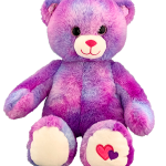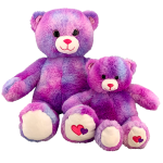 Amore the bear has beautiful pink and purple fur, with glitter accents, big sparkle eyes, and embroidered hearts on her foot. Show some love! Amore has plastic eyes!